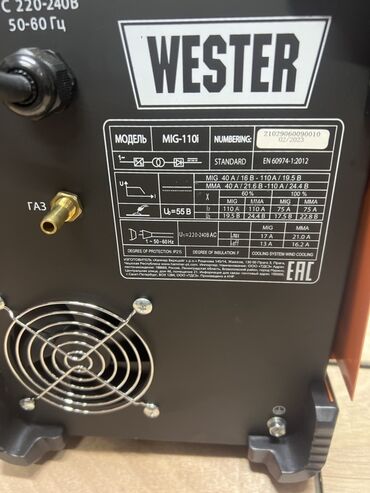 Сварочный инвертор Wester MIG-110I в оранжево-черном корпусе предназначен для различных видов сварки. Оснащен удобной панелью управления с регуляторами и индикаторами, а также встроенной ручкой для переноски, что делает его портативным и удобным в использовании. На задней панели расположен вентилятор для охлаждения и вход для газа, обеспечивая эффективную и безопасную работу. Подходит для использования в бытовых условиях, в гараже или на небольшом производстве.