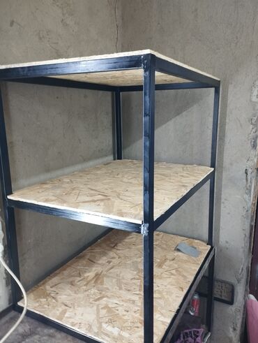 - Стеллажи: каркас из профильной трубы, полки из OSB или металла, настройка размеров по месту, выдерживают высокие нагрузки.