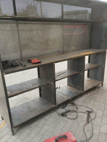 - Рабочие столы/верстаки: прочная стальная рама, столешница из листового металла или OSB/фанеры, возможны перфорированные экраны/панели для инструмента, верхние полки, тумбы и открытые секции для хранения.