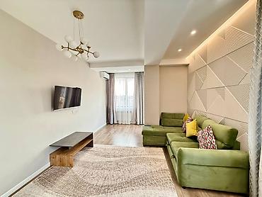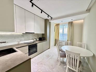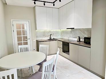 - Кухня: линейный гарнитур до потолка с большим количеством систем хранения, встроенная варочная поверхность и духовой шкаф, мойка, вытяжка, холодильная ниша, рабочая подсветка. В комплекте электрический чайник и СВЧ-печь. Обеденная зона с овальным столом и 4 стульями. Пол – керамогранит, трековое освещение.