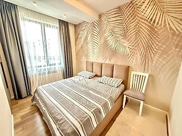 - Спальня: большая двуспальная кровать с мягким высоким изголовьем, тумбы, декоративная стена с принтом тропических листьев, плотные шторы и тюль, напольное покрытие – ламинированная доска.
