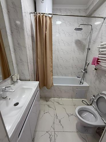 - Санузел совмещённый: ванна с тропическим душем и смесителем, раковина с тумбой, унитаз, полотенцесушитель, водонагреватель. Отделка под мрамор, керамическая плитка на полу и стенах.