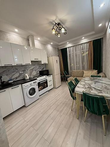 - Кухня в современном стиле: глянцевые шкафы, столешница с мойкой, варочная панель и духовой шкаф, вытяжка, холодильник, СВЧ‑печь, электрический чайник, обеденный стол из искусственного камня на 4 персоны, стиральная машина.