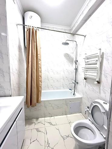 - Полотенцесушитель, тумба-раковина с выдвижным хранением, унитаз.
