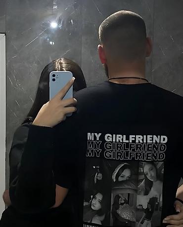 - Примеры на фото: коллажи с портретами, типографские дизайны, надписи «GIRLFRIEND / MY GIRLFRIEND», вариант с цитатой на русском.