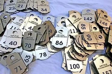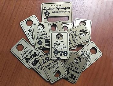 - Изделия: гардеробные номерки с отверстиями/прорезями, жетоны с нумерацией, именные бейджи, шильды и декоративные таблички с текстом/логотипом.