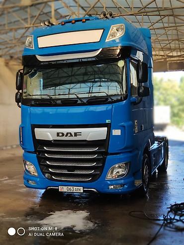 Подходит для междугородних и международных перевозок: низкий расход, высокий комфорт водителя, надежная трансмиссия DAF XF. Цвет — синий. Номера KG на фото.