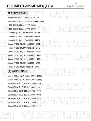 Хендай Соната 2 (Y-2) 1 2.0л, 3 2.0л, 2 2.4л, 3 (Y-3) 8 2.0л, 8 2.0л, 8 2.0л, 8 2.0л, H-1 (KIMO) 4 2.4л, Лантра 1 (J-1) 5 1.6л, 1.8л, H-1 Старекс (KIMO) 4 2.4л, H100 (P) 0 2.4л, 0 2.4л, Митсубиси Лансер 6 (CJ CP) 3 1.3л, Галант 5 (E1 A) 0 2.0л, 0 2.0л, 0 2.4л, 6 (E3 A) 2 2.0л, 2 2.0л, 2 2.0л, 2 2.0л, 2 2.0л, 2 2.0л, 2 2.0л, 7 (E5 A E7 A E8 A) 8 2.0л, 1996 2.0л, Спейс Вагон (D0 V/W) 1 2.0л, 1 2.0л, 1 2.0л, Эклипс 1 (D2 A) 5 2.0л, 2 (D3 A) 9 2.0л, L 300 3 (P0 W P1 W P2 W P3 W) 4 2.0л, L400 (PD W PC W PA V PB V PA W) 0 2.0л, Hyundai Sonata, Lantra, Starex, Mitsubishi Lancer, Galant, Spacewagon, Eclipse.