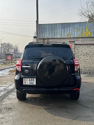 Toyota RAV4, 3-е поколение (рестайлинг). Кузов — чёрный кроссовер 5‑дверный. Ключевые особенности: - Полноразмерная запаска на двери багажника с фирменным кожухом. - Литые диски, всесезонные шины....