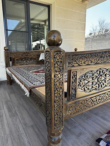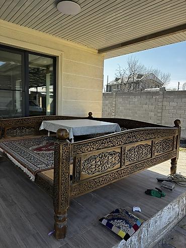 Резной деревянный тахта-лежак (айван/тапчан) для улицы и интерьера. - Материал: массив дерева. - Ручная резьба по всему периметру, декоративные панели с восточным орнаментом. - Высокие точёные сто...