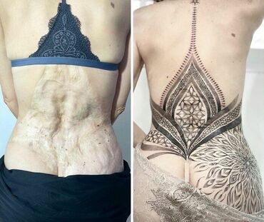 - Перекрытие и камуфляж шрамов и ожогов на спине и других зонах с помощью орнаментальных композиций: построение симметрии, подчеркнутые линии талии/спины, плавные переходы, проработка текстур для оптического выравнивания поверхности.