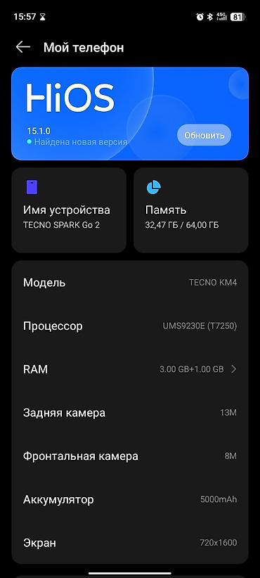 - ПО: предустановленные сервисы Tecno/HiOS на базе Android.