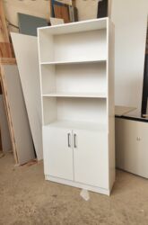Белые шкафы-стеллажи с распашными дверцами в нижней части. - Формат: два высоких модуля. - Конфигурация каждого модуля: 2 открытые полки сверху + закрытый шкаф снизу с двумя дверцами. - Цвет: белы...