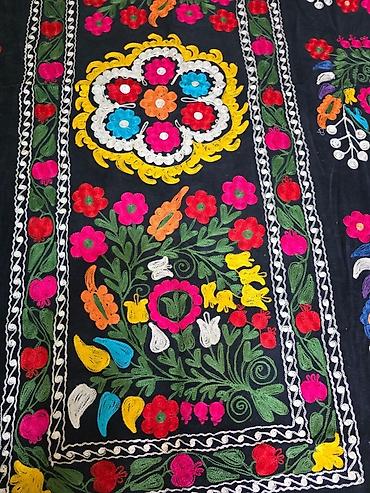 Текстильное панно (покрывало), выполненное в технике вышивки сузане, идеально подходит для украшения интерьера. Изделие отличается черным фоном и богатым узором из ярких цветов и растений, выполненных разноцветными нитями. Центральный медальон окружен симметрично расположенными цветочными композициями. Может использоваться как настенный декор, покрывало или элемент зонирования пространства. Размеры: 2,2 метр * 1,5 метр