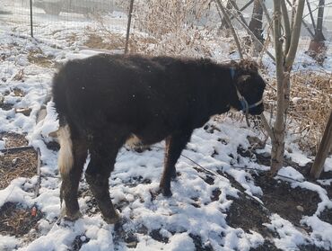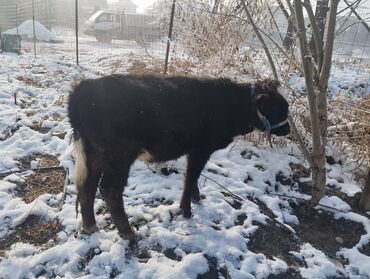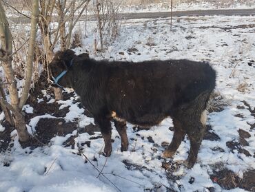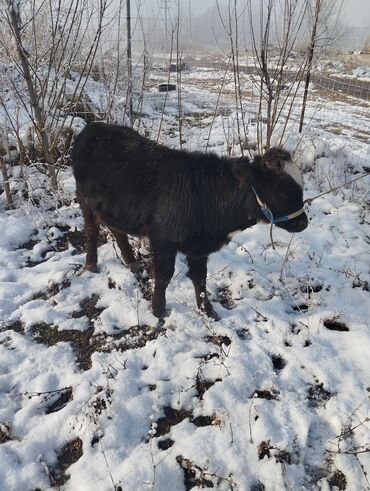Бык-производитель, чёрно-пёстрый окрас. Крупный, сильный, с широкой грудью и хорошо развитыми мышцами. Содержится в крытом загоне, на привязи, с кормушкой для сена. На фото — реальное животное, спо...