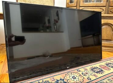 Телевизор LG, плоская панель с тонкой рамкой. Диагональ (112 см) 43 дюймаЧерный глянцевый экран, нижняя планка с декоративной вставкой «металлик», логотип LG по центру.