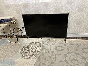 Телевизор с плоским экраном, диагональ примерно 55–60". Узкие рамки, тонкий корпус, установленные металлические ножки-подставки по краям. Подключение по питанию через стандартный сетевой шнур; предусмотрены задние порты для подключения внешних устройств (HDMI/USB — на корпусе). Подходит для установки на тумбу или возможен монтаж на стену через крепление VESA (крепление не показано). Чёрная глянцевая панель экрана, матрица без видимых трещин. Отлично подходит для фильмов, игр и стриминга при подключении к медиаприставке или ТВ‑приставке. Размеры по ширине ориентировочно 123–135 см, по высоте с ножками около 75–85 см. Комплект: телевизор, сетевой кабель.