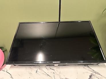 Телевизор Samsung с пультом ДУ - Диагональ экрана ориентировочно 32–40" (визуально средний формат для гостиной/кухни). - LED‑подсветка, плоская панель. - Чёрный корпус, тонкая рамка. - Настольная ...
