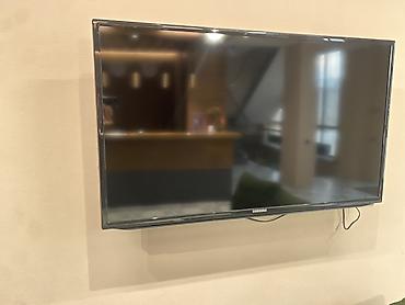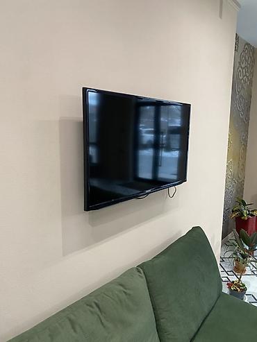 Телевизор Samsung, диагональ 40–43". Плоская LED‑панель, тонкая рамка, черный глянцевый корпус. Установлен на настенном кронштейне (VESA), кабель питания снизу. Подходит для гостиной, спальни или офиса.