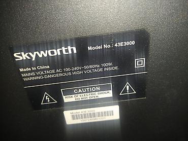 Модель: 43E3000. Производитель: Skyworth (Made in China). На задней панели предупреждение о высоком напряжении (штатная маркировка).