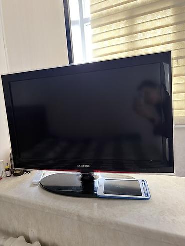 Также на фото — отдельный телевизор Samsung с подставкой (классический корпус с толстой рамкой). Это полноценная панель для установки на тумбу/полку, управление пультом, подключение внешних источников через HDMI/AV.