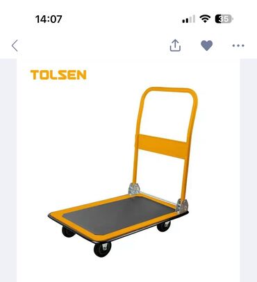 Желтая тележка-транспортер Tolsen 62610 с двумя пневматическими колесами. Прочная стальная конструкция с удобной ручкой и широкой опорной платформой. Предназначена для перевозки тяжелых грузов, как...