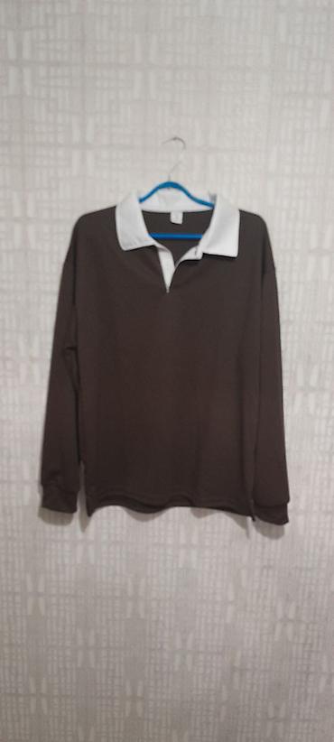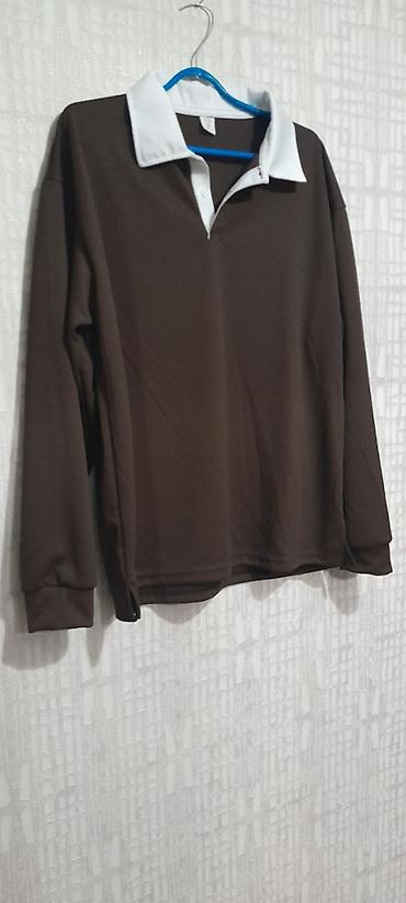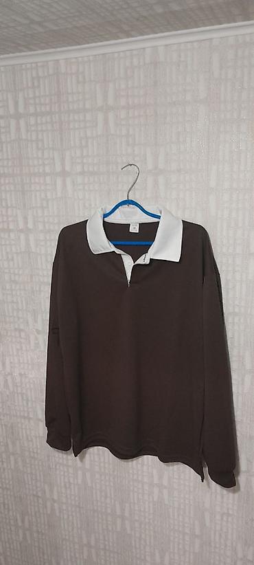 Тёмно-коричневое поло с длинным рукавом и контрастным белым воротником.