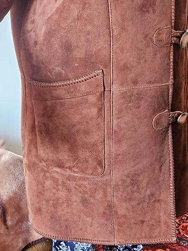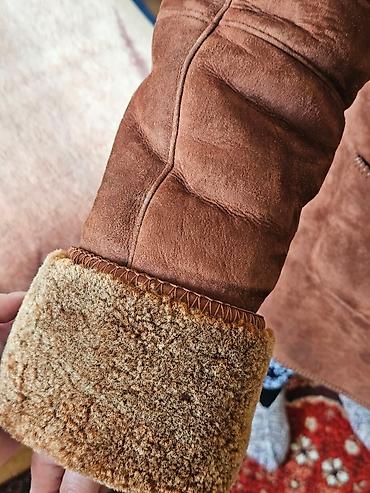 Цвет — тёплый коричневый (коньячный). Воротник и манжеты — густой мех, крупные кожаные пуговицы-завязки, качественные строчки, прочная фурнитура.