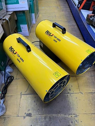 - Газовые пушки ROLF серий TOP-40RA и TOP-50RA (мощность 40 и 50 кВт, указано на корпусе) — компактные, с верхней ручкой для переноски и сетевым кабелем.