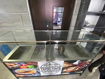 Габариты ориентировочно: ширина около 1,8–2 м; глубина около 0,7–0,8 м; высота витрины около 1,2–1,3 м (по визуальной оценке с фото).