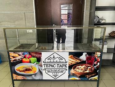 - Конструкция: стеклянная витрина с рабочей ванной из нержавеющей стали, фронтальная панель с брендингом «ТЕРАС ПАРК».