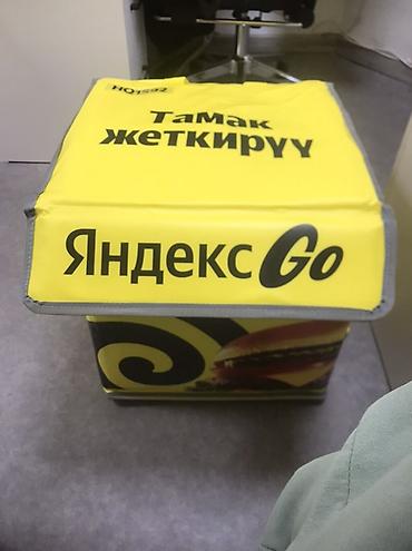Термо-рюкзак курьерский Яндекс Go для доставки еды. - Формат: жёсткая изотермическая коробка-рюкзак. - Цвет и брендинг: жёлтый с логотипами «Яндекс Go» и надписью «Тамак жеткирүү». - Конструкция: ...