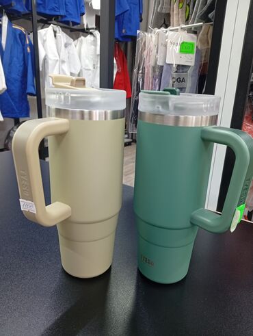 - Дорожные термокружки с ручкой, матовое покрытие и двойные стенки из нержавеющей стали. Объём большой (формат XL), удобная высокая форма под подстаканник, герметичная прозрачная крышка с откидным носиком. Цвета на фото: бежевый и зелёный. На ручке брендинг TYESO.