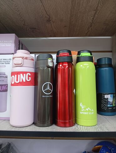- Спортивные и городские термосы/бутылки с вакуумной изоляцией. Металл, двойные стенки, кнопочные/зажимные крышки с носиком для питья. Разные дизайны: однотонные (красный, салатовый, синий и др.), «Mercedes‑Benz», «Sport Cup», «YOUNG». Подходят для горячих и холодных напитков, сохраняют температуру длительное время. Форм‑фактор – стройные колбы на 650 мл и выше (по размерам на фото), эргономичные для рюкзака и подстаканника.