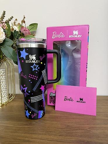 - Barbie × Stanley: черный корпус с неоновыми звездами; фирменная розовая коробка.