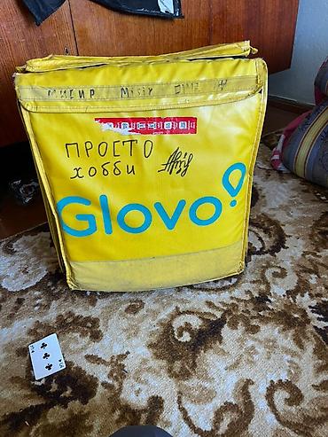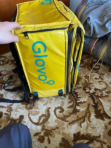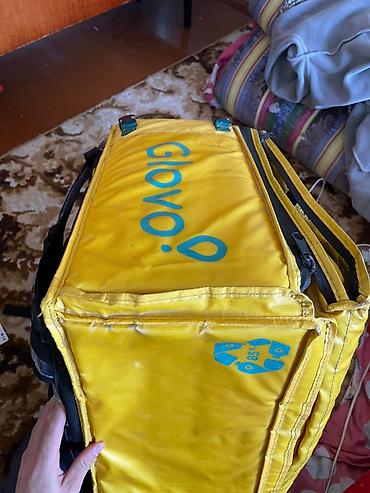 Терморюкзак курьера Glovo, жёлтый, кубической формы.