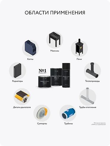 Антикоррозионная и декоративная окраска металлических конструкций и оборудования, подвергающихся высокой температуре: печи (в т.ч. для саун), камины, дымоходы, мангалы, радиаторы, теплопроводы и трубы отопления, детали двигателя, выхлопные системы авто, суппорты, турбины, котлы, емкостное оборудование. Также подходит для минеральных поверхностей, эксплуатируемых в условиях умеренного климата.