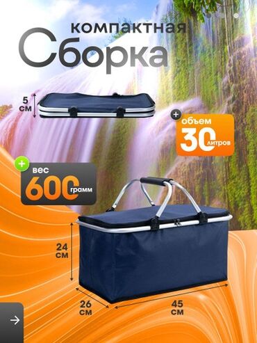 Габариты в разложенном виде: 45 × 26 × 24 см. Цвет: темно-синий. Идеальна для пикников, поездок и хранения охлажденных или теплых блюд.