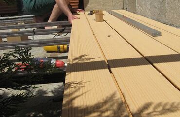 - Применение на фото: настил террасы и процесс монтажа.