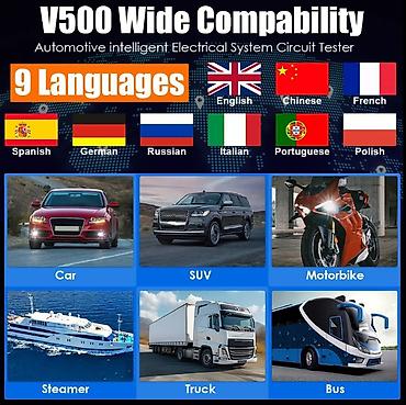 VDIAGTOOL V500PRO автомобильный тестер имеет широкую совместимость и поддерживает диагностику силовых схем автомобилей, грузовиков, мотоциклов и даже судов; в то же время, он поддерживает измерение рабочего напряжения постоянного тока 9 В-30 В, напряжение 0,1 В-100 В, резисторы 0KR - 200KR.