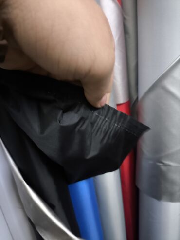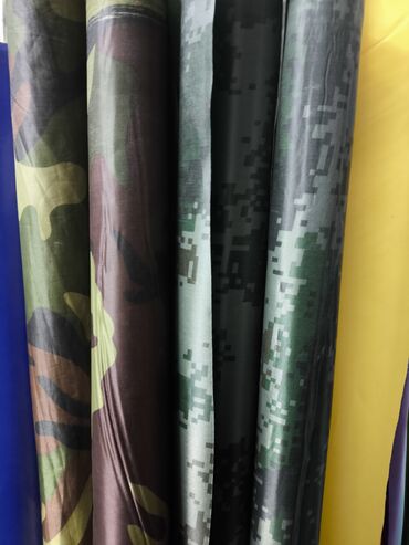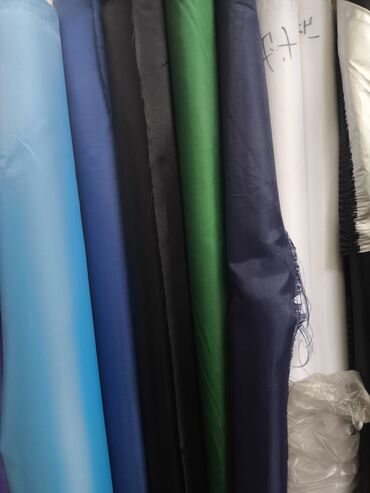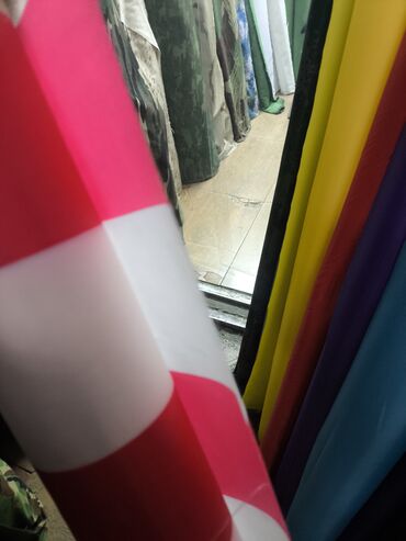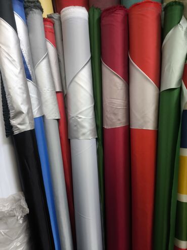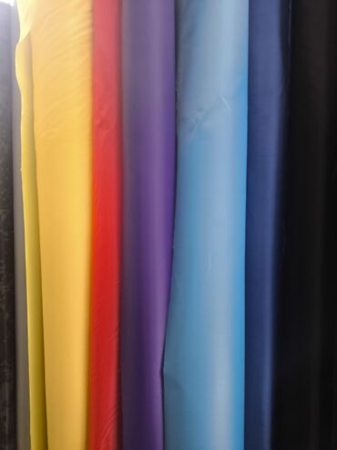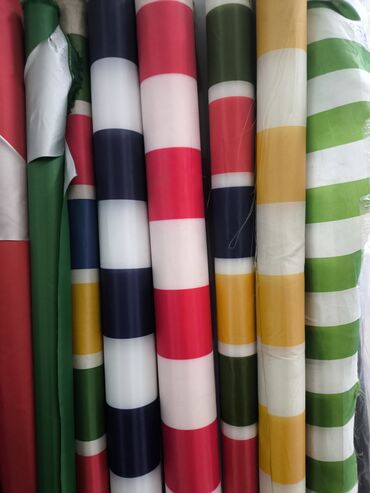 - Ассортимент: плотные однотонные полотна (черный, белый, серый, синий, голубой, зеленый, красный, желтый, фиолетовый и др.) и ткани с горизонтальной полосой крупного раппорта (красно-белая, темно-синяя/белая, зеленая/белая, горчичная/белая и др.).