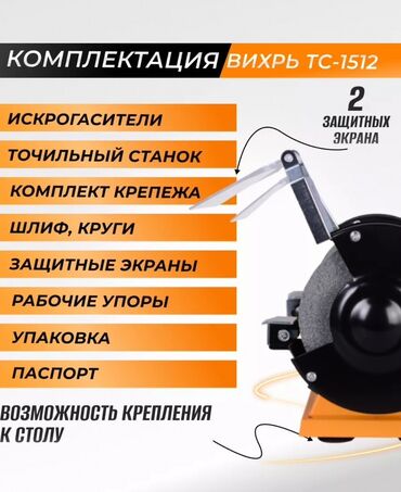 Точильный станок Вихрь ТС-1512 мощностью 150 Вт предназначен для заточки различных инструментов. Скорость вращения круга составляет 2950 об/мин, диаметр круга - 125 мм. Оснащен защитными экранами для безопасной работы и искрогасителями. Возможно крепление к столу для устойчивости во время использования.