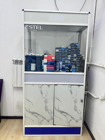 - Верхняя часть — застекленная экспозиционная зона с раздвижными стеклянными дверцами и замком; подходит для демонстрации косметики, красок для волос и профессиональных средств.