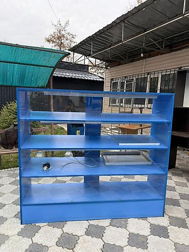 - Прозрачная витрина-прилавок синего цвета: несколько уровней полок, фронтальное остекление, боковые стенки из стекла/оргстекла. Подходит для выкладки кондитерских изделий, мелкой электроники, аксессуаров, табачной продукции, сувениров.
