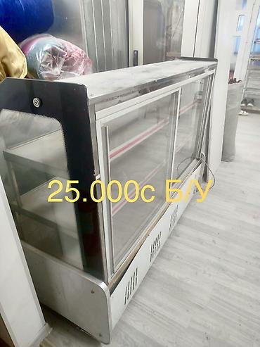 2) Прилавочная холодильная витрина со стеклянными раздвижными дверцами и полками. На фото указано: 25 000 с, Б/У.