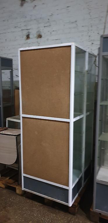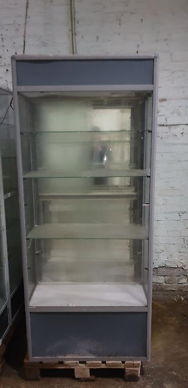 - Вертикальные витрины с алюминиевым/металлическим каркасом, остеклением по периметру и глухой задней стенкой из ЛДСП (у части секций — прозрачные боковые стенки).