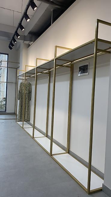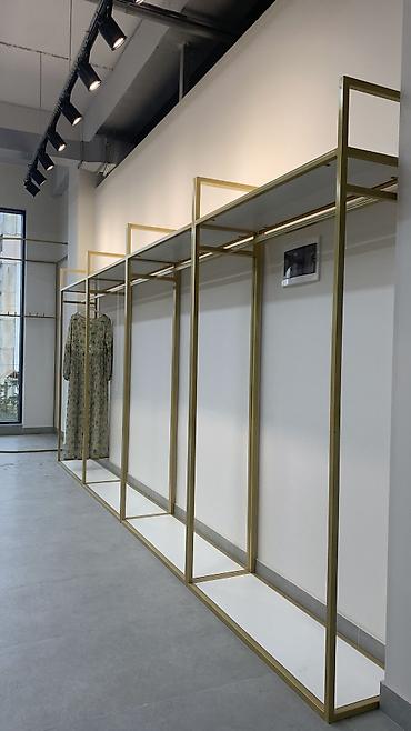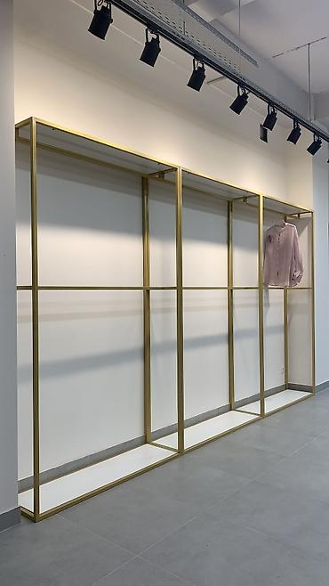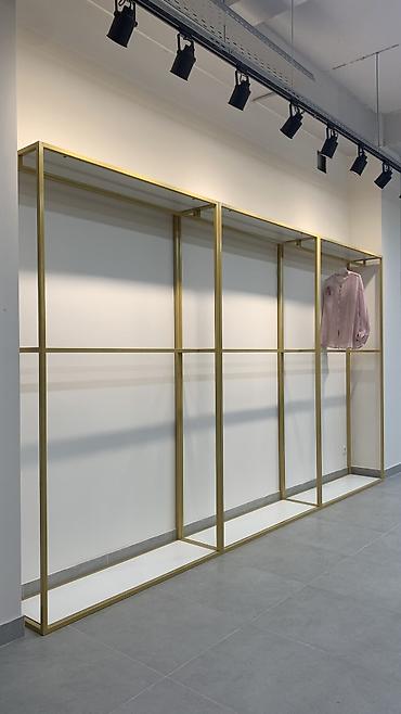 - Пристенные модули каркасного типа с верхней полкой и штангой для вешалок. Блоки секционного построения позволяют собирать длинную линию экспозиции.