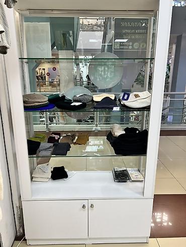 - Витрина с тремя стеклянными полками и прозрачными боковинами/дверцами — удобно для выкладки головных уборов, перчаток, аксессуаров, косметики и т. п.
