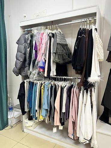 - Отдельная напольная стойка-рейл для одежды с двумя уровнями перекладин: верхний — для длинных вещей, нижний — для блузок, свитшотов, кардиганов. Широкое основание, возможна установка коробов/обуви снизу.