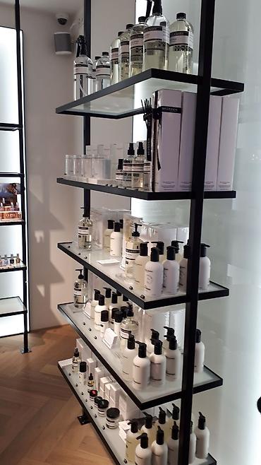- Дизайн: современный минимализм — черный металл + белые/стеклянные/деревянные полки. Подходит для премиальной выкладки косметики, уходовых средств, парфюмерии.